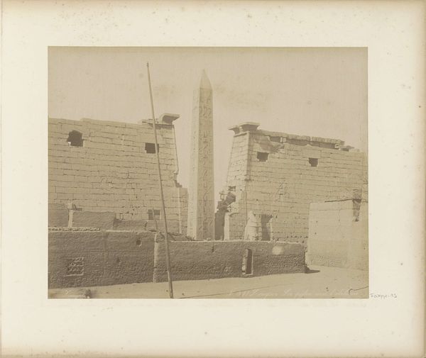 Curator: I find this rather faded albumen print intriguing. Entitled “Persoon te paard voor een kiosk,” it was created sometime in the 1850s or 1860s by Gustav Richard Lambert. Editor: My initial impression is one of stillness and faded glory. The composition is very formal, even rigid, centered around this strange, almost fantastical kiosk. It evokes a specific time but feels… incomplete. Curator: The flags atop the kiosk are particularly evocative. They might suggest a gathering, a celebration. What narratives could they evoke from that era? Perhaps a state visit, or a local festival infused with patriotic fervor? It seems more than just an innocent scene; there are possible undertones of empire. Editor: Observe the way the light interacts with the surfaces. It’s muted, but you can still discern the various textures – the rough ground, the smooth facade of the kiosk. Lambert clearly understood how to translate three-dimensional space into a photographic plane. The print’s tonal range is restricted. Curator: And the figures are strategically placed. The man on horseback acts almost as a symbolic sentinel. He's at the front gate between civilization and wild nature. Lambert is telling us, subconsciously, of transition from country to urban areas with some implied security, of course. Editor: That kiosk... Its architectural form seems vaguely classical but there's something almost ephemeral about it. It’s solidity is suggested, but the lack of true clarity diminishes its sense of purpose. Like a Potemkin village in waiting. The flags imply some state function. Curator: Absolutely. And this photograph isn't merely documenting reality. It uses visual emblems to portray aspiration. Remember, photography in this period carried significant cultural weight, almost perceived to give a sort of legitimacy. This work reinforces ideas of order, authority, maybe even progress. Editor: Yes, perhaps through today's lens we might almost see the photo's message and content as now empty and eroded. Still, Lambert’s subtle composition and considered use of light makes "Persoon te paard voor een kiosk" an image worth preserving as document of intent if nothing else. Curator: A fleeting tableau of ambition made permanent through the lens. Fascinating.