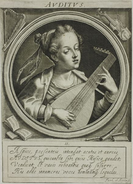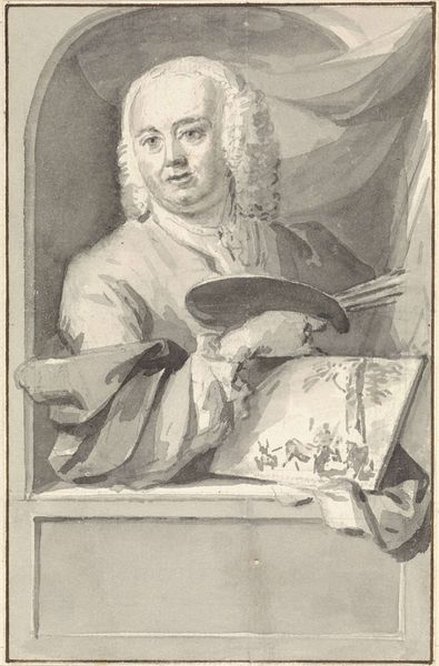 Editor: This is a print from the Art Institute of Chicago called "Portrait of Jean-Féry Rebel, Composer to the King," created between 1726 and 1731 by Jean Moyreau. The etching on paper shows a composer with a quill poised over a musical score. It’s interesting how the artist chose to depict him mid-composition, seemingly capturing a fleeting moment of creative inspiration. What jumps out at you? Curator: What strikes me is the carefully constructed public image presented. This portrait isn't just about depicting an individual; it's about showcasing the power and status associated with being "Composer to the King" in the French Baroque court. Consider the wig, the lavish clothing, and the very act of composing – these were all symbols carefully curated to convey authority and talent. How do you think this image served the sitter's and perhaps even the monarchy's interests? Editor: I guess it's about legitimacy. The details suggest refined artistic skill but also the official sanctioning of his position. He isn’t just composing; he is *employed* to compose by the King. Curator: Precisely! Think about the role of the Académie Royale in that era. Institutions like that helped establish artistic standards, and royal patronage was vital for artists. This portrait reinforces those power structures by associating Rebel with both royal authority and recognized artistic merit. Notice how the etching medium itself, easily reproducible, allowed this image and the message it carried to circulate widely. How does this affect our understanding of his legacy, today? Editor: I didn’t think about how prints made the image so accessible, so he’s not just famous in court but has wider recognition. That definitely gives another dimension to the idea of the ‘artist’. Thanks, I never would have thought about the political layers of a portrait in such depth! Curator: It is always worthwhile looking at artworks as social and cultural products of their time.