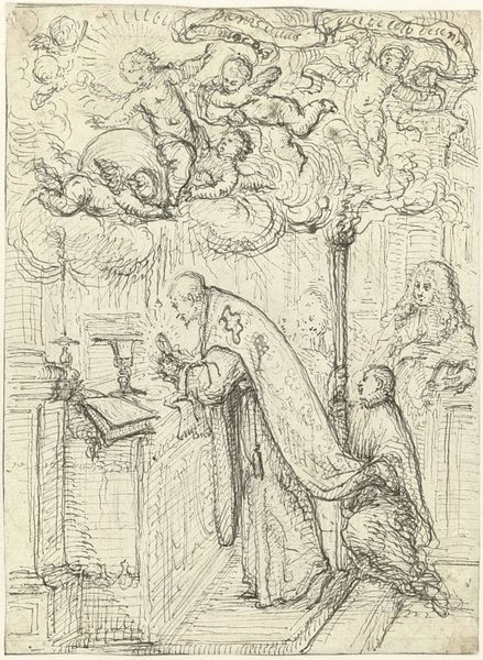 Andrea Mantegna created this engraving of Maria and child surrounded by angels in a cave, with Joseph and a king in adoration, sometime in the 15th century. The eye is immediately drawn to the central grouping of the Madonna and Child, framed by a multitude of cherubic faces peering out from the dark recesses of the cave. Mantegna employs a meticulous, linear style that defines every form with sharp precision. The texture of the rock, the folds of fabric, and even the delicate wings of the angels are rendered through a dense network of lines. The composition invites us to consider the space not as a divine spectacle, but as a carefully constructed environment where the interplay of light and shadow, form and line, articulate a complex semiotic system. In closing, notice how the precise arrangement of figures and the stark, graphic quality of the engraving underscore a moment of profound theological significance.