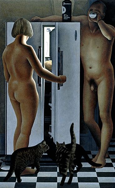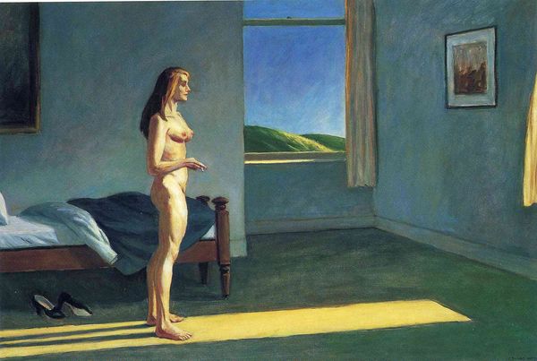 Curator: Let's turn our attention to "Nude and Dummy," painted by Alex Colville in 1950. It's a tempera on board depicting a female nude facing away from us, gazing out a window, with a dressmaker's dummy looming in the foreground. Editor: Well, my first thought is how cold the whole scene feels! It's got that slightly menacing Edward Hopper vibe, but colder somehow. A stark interior, a figure almost cornered... the muted greens and blues certainly don’t help. Curator: It’s interesting you pick up on that sense of isolation. Colville's work often reflects anxieties of the postwar era, a certain detachment even within domestic settings. Consider the use of the dummy itself, a stand-in for human presence, yet utterly devoid of life. Editor: Right! Like a ghostly roommate you can't quite shake. The dressmaker’s form mirrors, yet also parodies, the living figure in the composition. Both are literally bare, vulnerable to the scrutiny of the gaze, be it external or internal. Is it a reflection on objectification, or simply the artist searching for some symmetry? Curator: That tension is key, I think. The work challenges conventional notions of beauty and the female form. And don’t forget the geometric starkness of the setting. The bare attic room and the angled ceiling emphasize a psychological unease. Editor: I find the distant view through the window unsettling. Is that farmland? A strange pyramidal structure seems imposed onto the scene. Nature tamed, almost weaponized by the geometrical shape and, also maybe to show a link between geometry and the figure? I do love the underpainting! Curator: It hints at a world beyond this claustrophobic interior, yet it offers no real escape. In many ways, it symbolizes a tension between freedom and constraint, internal and external pressures – which can perhaps be reflected in Canadian art in this era. Editor: Exactly! "Constraint," you said it! It almost feels like both figures—real or not—are performing for an audience that might not even be there. That silent observation adds another layer of discomfort, yet the quality of observation from both of their parts in that frozen-in-time stage, are the qualities of the best drama... Curator: Ultimately, "Nude and Dummy" prompts us to question our assumptions about representation, identity, and the relationship between ourselves and the spaces we inhabit. Editor: I will take some time to absorb the implications of "ourselves and the spaces we inhabit," in a painting so barren and full of suggestion, at the same time.