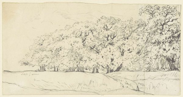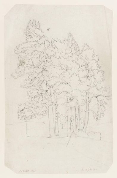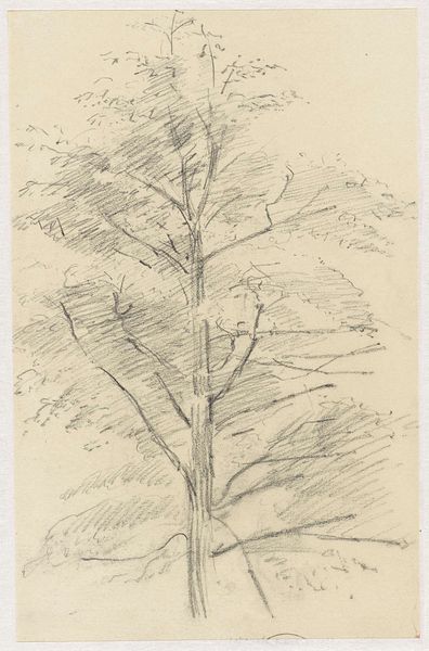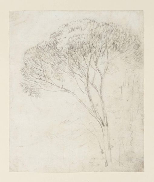Curator: This undated drawing by Joshua Cristall, held in the Tate collections, presents a tree using graphite on paper, measuring 193 by 137 millimeters. Editor: It feels stark and solitary. The tree, almost skeletal in its rendering, dominates the composition. Curator: Indeed, Cristall's focus is on the structural form. Note the sinuous lines defining the trunk and branches. The texture relies on the interplay of light and shadow, achieved through varied pencil strokes. Editor: I wonder about the social context. Was Cristall romanticizing nature, escaping the burgeoning industrial revolution? What did landscape represent for people of his era? Curator: Such inquiries certainly enrich our understanding. However, let's not overlook the pure artistry—the way Cristall captures the tree's essence with such economical means. Editor: But isn't the "essence" shaped by the social and political climate? The tree may symbolize resilience, a counterpoint to urban decay, or even England's colonial reach. Curator: Perhaps. It is a fascinating subject for continued investigation. Editor: Absolutely. A stark reminder of the dialogue between nature and society.