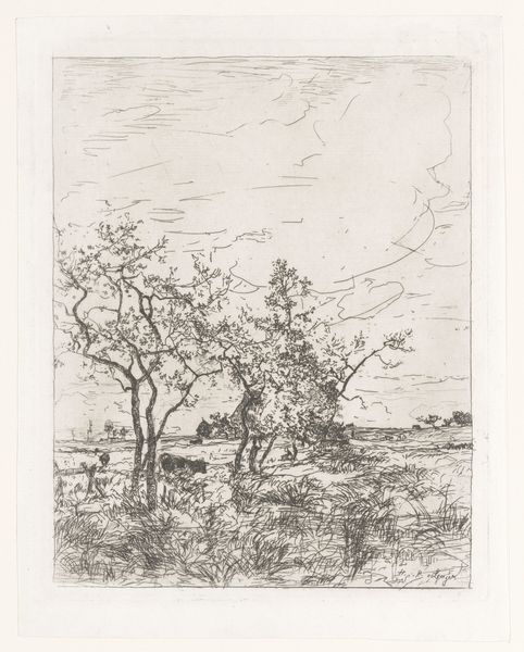 Pieter Ras created "Farm and Trees" using black chalk and stump on paper. Born in the Netherlands in 1857, Ras lived during a time of significant social and economic change, as industrialization began to transform rural landscapes. This drawing captures the intersection between the intimate and the immense; it evokes a sense of longing for a simpler life. The humble farmhouse, almost hidden by the looming trees, suggests a narrative of coexistence between humanity and nature. The dark, sweeping strokes of chalk create an atmosphere of quiet solitude, yet the density of the marks hint at the emotional weight carried by this seemingly tranquil scene. Ras's decision to portray this subject matter, with such somber intensity, invites us to consider the personal and collective implications of our ever-changing world. The artwork reminds us of the emotional and personal dimensions of landscape.