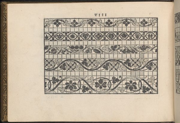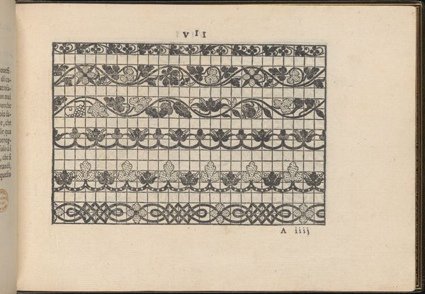 This is a page from ‘La Vera Perfettione del Disegno di varie sorti di recami’ by Giovanni Ostaus, dating back to the 16th or 17th century. The overall impression is one of geometric precision, dominated by a grid-like structure filled with ornate patterns. The stark contrast between the black ink and the off-white paper gives it a striking visual clarity. The composition relies on the systematic repetition of motifs within the grid, a design strategy which creates a sense of order. Yet, this is juxtaposed with the intricate details of each individual pattern. The inclusion of a circular emblem containing what appears to be an eagle disrupts the rigid grid and introduces a focal point. The artwork functions as both an aesthetic object and a practical guide for embroidery. As such it challenges our ideas about the division between art and craft. It is an intersection of form and function, where artistic expression is intertwined with the systematic planning necessary for textile production. The grid-like structure could be seen as a semiotic system, with each cell acting as a signifier that contributes to the overall visual language of the design. The book invites us to see beyond its immediate aesthetic appeal and to consider the cultural and historical context in which it was created.