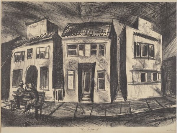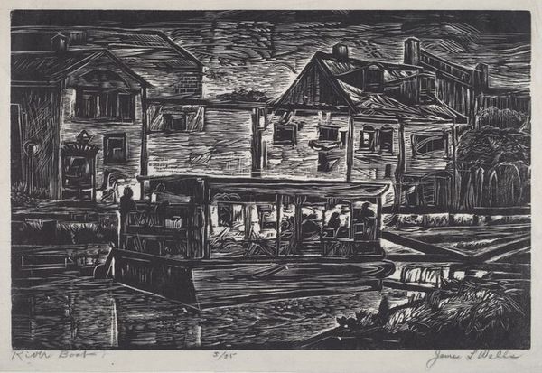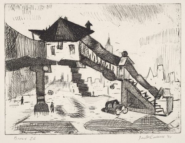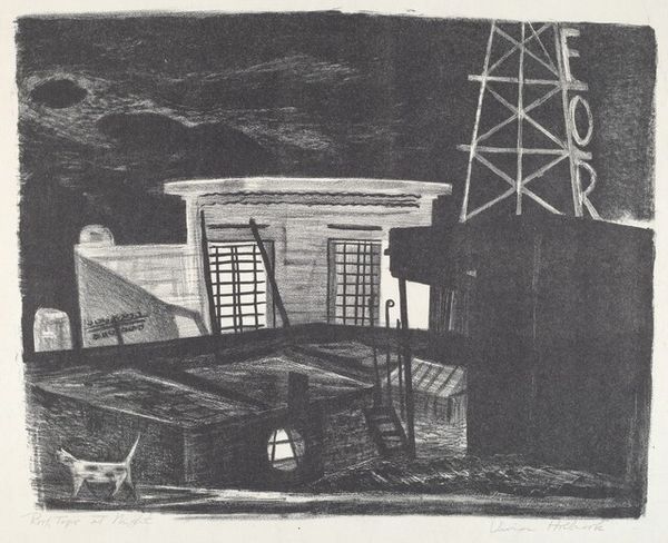 Editor: We're looking at Keith Allen Crown’s "The Strand (right panel)" from 1948, created using graphite in print. The dark contrasts and sharp angles give it a rather stark, industrial feel. What catches your eye about this print? Curator: The power of this work lies in its masterful use of contrasts and linear perspective to create a compelling composition. Notice how Crown manipulates light and shadow to emphasize the geometric forms of the buildings and industrial structures. The precision of line work gives the drawing its strength. What visual relationships do you observe between the elements? Editor: Well, the parallel lines of the pier supports and the smokestacks in the background definitely create a sense of depth and repetition. It seems very carefully arranged. Curator: Precisely. The relationship between these elements dictates the overall visual hierarchy. It also speaks to the artist's careful construction of space through purely formal means. We might also consider the textural variety created simply through hatching and cross-hatching. What is your response to the surface? Editor: It almost feels like a photograph in its detail, despite being a drawing. I didn’t initially think that the subject was necessarily beautiful, but looking at the technical skill involved, it definitely changes my perspective. Curator: Indeed. Its beauty resides not in its subject but in its form. Crown's skillful articulation of shapes and textures imbues the work with an inherent aesthetic quality, irrespective of its industrial subject matter. Editor: I see now how analyzing the formal elements brings out an entirely different layer of understanding, detaching it from any need for explicit storytelling. Curator: And how a certain understanding of form allows it to succeed despite the apparent harshness of the represented industrial structures. Editor: I really appreciate learning how to shift focus and discover new things just through close visual analysis. Curator: Absolutely, this detailed investigation helps clarify how artworks speak for themselves through masterful control of fundamental elements.
