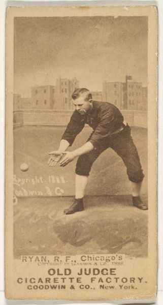 This is a photographic print from the Old Judge series, created in the United States in 1887, by Goodwin & Company for their cigarette brand. The image shows a baseball player, Ryan, who played right field for Chicago. Consider the cultural status of baseball at this time. It was becoming America's pastime, a focus for civic pride, and an arena for the display of masculine ideals. Here we see how the emerging mass media of photography and printmaking was being used by commercial enterprises to promote both a new form of celebrity and a new culture of consumption. The branding is clear - "Old Judge Cigarettes" - linking the ideals of sporting prowess with the pleasures of smoking. To understand this image fully, we could look into the history of baseball, advertising, and the tobacco industry. By studying these histories, we can better understand the social forces that shaped this artwork and its original audience. The meaning of art is always contingent on its social and institutional context.