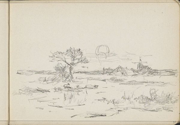 Willem Cornelis Rip made this sketch, Man in a Meadow Near a House, with graphite on paper, most likely in the Netherlands. The scene depicts a lone figure walking towards a modest dwelling, nestled in a pastoral landscape. The sketch resonates with the cultural values of the late 19th and early 20th century Netherlands, with the rise of landscape painting. The emphasis on the ordinary and the everyday connects with a broader cultural movement toward valuing rural life and a move away from academic styles that had previously been dominant. The sketch offers a quiet reflection on the relationship between humanity and nature. Understanding this work requires us to consider the cultural and institutional contexts that shaped Rip’s artistic vision. Archival research into the artist's life, the art market, and exhibition histories of the period would shed light on how this simple sketch speaks to larger social and cultural narratives of its time.