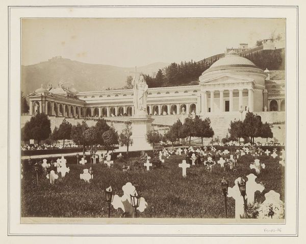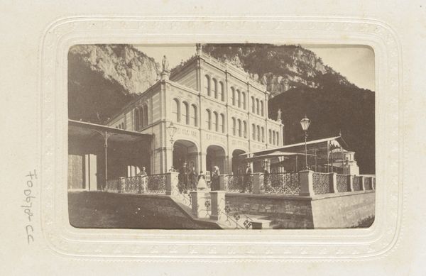 Curator: Here we have Celestino Degoix’s "Exterior of a Villa, Presumably in the Genoa Region," an albumen print dating from around 1870 to 1890. It has a palpable sense of time about it, a preserved stillness. What are your initial thoughts? Editor: The materiality strikes me first. Look at that delicate tonality. Albumen printing, of course, creates such a subtle range – the details practically emerge from the paper itself. There is an implied opulence. Curator: Indeed. The architectural grandeur, set within what looks like an abundant, tended garden. The villa itself looms, but not menacingly. It carries the symbols of wealth, but also perhaps a lived, familial history. Editor: I agree about the wealth. These staircases wouldn’t just *appear*. Labor, material, quarrying – there are complex stories of social power embedded within those meticulously laid stones. Curator: But those steps! Consider how stairs appear often as transformative symbols, a connection between different levels of existence, the villa to the landscape. Does it evoke upward aspiration or the burden of legacy? Editor: More burden than aspiration, I suspect. Those meticulously built levels shout to me of resources consumed. Photography, at this point, becomes a means of documenting privilege – almost enshrining it. Who did this image serve? Curator: Perhaps Degoix saw beauty in structure and light, a captured moment of serenity in that coastal region. We can also wonder if Degoix's use of a 'natural palette' signifies his adherence to the conventions of Realism in the later 19th century. Editor: Maybe. But Realism still gets rendered through someone’s vision, and someone else's lens. These 'villas', this landscaping – that tells a far more complicated story about labor and taste of that era than this composition can visually disclose. Curator: Fair enough. Still, the echoes of an era captured, inviting us to contemplate not only what we see but also how that image continues to reflect our present. Editor: Exactly. Material culture, social standing and artifice – the villa embodies all three, and reminds us what is lost when the frame obscures what’s really happening on the ground.