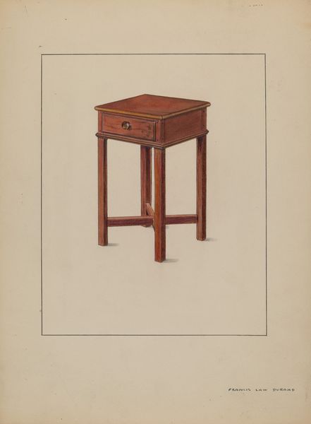 Curator: Today, we are looking at Edna Rex's watercolor painting, "Sewing-table," created sometime between 1935 and 1942. Editor: There's an almost eerie quietness about this piece. The muted colors and isolated subject create a feeling of suspended animation. It’s like the table is waiting, holding its breath. Curator: Well, the sewing table was an essential piece of domestic furniture in many American homes during this period. It represented a particular kind of labor, usually gendered. Editor: Absolutely, and notice the exquisite rendering of the wood grain, the subtle gradations of light on the surface, and the way the artist captures the form with such simple washes of color. It emphasizes the objectness of this table. It’s undeniably solid. Curator: It does have a lovely academic realism. These types of images reinforced the values associated with domesticity. A subtle piece of propaganda, you might even say. Especially when we consider that many women had entered the workforce during and after World War I, so this table in its simple rendering reaffirms traditional roles. Editor: A domestic monument, then? I see it in how the artist centers it. Everything is symmetrical; everything conforms to that stillness I mentioned. And did you see the subtle suggestion of depth, the minimal shading that hints at a space around it? This elevates the mundane to the significant. Curator: Exactly! The "Sewing-table" acts as a potent reminder of the societal expectations and labor divisions that shaped mid-20th century American life, all subtly packaged within a simple painting. It’s not just about skill with watercolours; it’s about reinforcing a specific role and expectation. Editor: Fascinating how something so understated formally can resonate so profoundly, revealing so much with so little apparent drama. Curator: Yes, that simple table becomes a window into a world of cultural values and lived experiences. Editor: And what seemed still now pulsates with that deeper meaning.