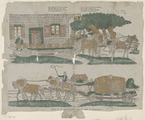 Jan de Lange II created this print, "Bierwagens," in the 19th century, employing line and muted colors to depict two scenes of beer wagons. The composition is divided horizontally, presenting two distinct yet related narratives of transportation. The texture of the paper contributes to the overall rustic feel, evoking a sense of historical documentation. De Lange's work uses repetition and variation to explore themes of labor and commerce. The formal arrangement, splitting the scene into two registers, emphasizes the cyclical nature of production and consumption. Each wagon, rendered with careful attention to detail, becomes a signifier of economic activity and social life. This diptych-like structure invites a comparative reading, challenging the viewer to consider the broader implications of these everyday scenes within a growing industrial landscape. The linear quality of the print, combined with its subdued palette, serves not only to illustrate but also to subtly comment on the structural frameworks of society.