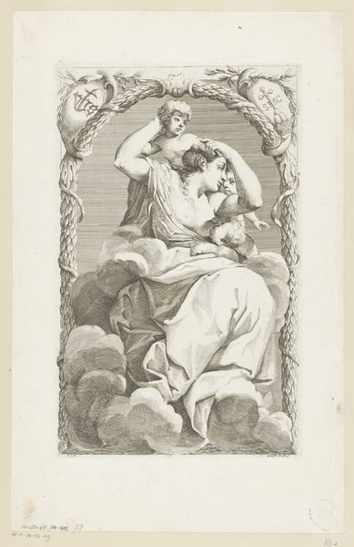 Giovanni Girolamo Frezza created this print, "Mercurius gives Paris the golden apple," in the 18th century. The composition is striking, staging the seated Paris extending an arm to receive the infamous golden apple offered by a floating Mercurius in the upper half. Frezza’s masterful handling of line and shadow creates a dynamic interplay between form and space. The figures, rendered in meticulous detail, seem to emerge from the shaded background. The bodies are idealised, evoking a sense of classical antiquity. The linear precision in the rendering of their musculature and drapery brings to life a scene of mythological significance. The print destabilizes traditional notions of representation by focusing on the moment of exchange, emphasizing the narrative's tension and moral weight. The visual arrangement guides the viewer's eye from the poised figure of Mercurius to the receptive Paris, underscoring the pivotal choice that precipitates the Trojan War. It is a piece that invites contemplation on destiny, choice, and the consequences thereof.