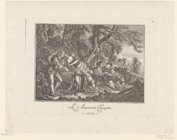 This small print, titled "Landelijk plezier", or "Country Pleasures", presents us with a tableau of leisure. Note the central motif of entwined cherubic figures above the fountain, reminiscent of classical representations of Eros and Anteros, symbolizing love reciprocated. The idyllic landscape, populated by lounging figures and grazing sheep, evokes the classical idea of Arcadia, a pastoral paradise. Now, consider the evolution of this Arcadian ideal: from Virgil's bucolic poetry to Renaissance paintings, and here, in this print. Each era reinterprets the symbol, imbuing it with new cultural meanings, desires, and anxieties. The longing for a simpler, more harmonious existence transcends time. It resurfaces, evolves, and takes on new meanings in different historical contexts. The motif of Eros, representing the primal force of attraction, appears again and again through visual culture. It engages viewers on a deep, subconscious level, evoking intense emotional states.