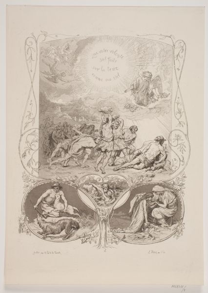 This is “The Calling of the Apostles St. James and St. John” an engraving made by Friedrich August Pflugfelder sometime in the mid-19th century. Engraving, as a method, is fascinating. Here, the artist incised an image onto a metal plate, likely copper. This was a skilled and laborious task, demanding precision and control to create the fine lines and details that define the composition. Ink would then be applied to the plate, filling the engraved lines, and the excess wiped away from the surface. Finally, paper was pressed against the plate, transferring the ink and revealing the image. Think of it: each print requires the entire process to be repeated. It speaks volumes about the value placed on reproduction and dissemination of images during this period, particularly religious ones like this. The labor invested in the creation of each print underscores the significance of the message it conveys, and the reach of the church. In this way, even a humble print can give insight into the cultural values of its time.