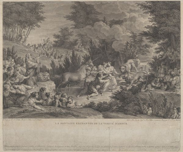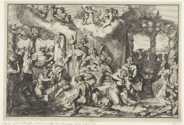 Editor: Here we have Johann Sadeler I's engraving, "Begin van de zondvloed," from 1586, currently held at the Rijksmuseum. Looking at the intricate lines and dramatic figures, the overwhelming feeling I get is one of chaos. It's just... a lot. What leaps out to you in this piece? Curator: The formal elements certainly establish a sense of dynamism. Note how Sadeler employs dense, almost frenetic cross-hatching to depict the torrential downpour. The lines not only represent rain but also contribute to the overall visual busyness, mirroring the turmoil of the depicted scene. How does the artist manage the picture plane's depth? Editor: Well, it seems like the foreground figures are more detailed, almost exaggerated in their musculature and poses. Then the background blurs with the rain, shrinking the Ark, making everything behind seem distant and...doomed? Curator: Precisely. The composition is carefully structured to guide the viewer's eye. Consider the positioning of the figures - a clear hierarchy. Note the expressive rendering of their bodies – these aren't simply depictions of drowning figures, they’re demonstrations of Mannerist ideals, emphasizing artificiality and exaggerated forms for dramatic impact. Editor: So, the almost unnatural poses add to the feeling of unease, highlighting the artist's skill in using form to convey a particular emotion? Curator: Absolutely. Sadeler uses the human form and his medium’s capabilities to the utmost in communicating the narrative and enhancing the emotional resonance. Are these artistic devices merely illustrative or indicative of broader themes within the work? Editor: I never considered engravings having so much expressive potential! Looking at the layering and details, it adds so much depth to a medium I thought was just for reproduction. Curator: Indeed, it pushes us beyond mere representation, prompting deeper engagement. I learned much from your perception today. Editor: Same here. I appreciate learning to think of this artwork in terms of form, not just theme.