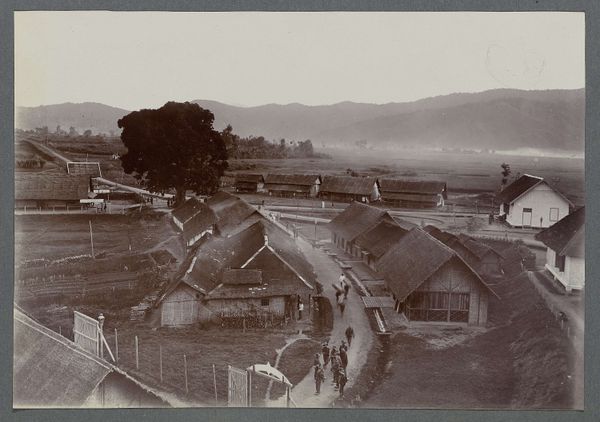 Curator: Right, let's turn our attention to this fascinating image by Giacomo Brogi. It's titled "Restanten van het Huis van de Gladiatoren te Pompeï," dating from 1864 to 1881. A gelatin-silver print... quite evocative. Editor: My first thought? Echoes. This sepia-toned landscape just whispers of lives and spectacles long gone. The ghostly arcade surrounding that open arena...it's both peaceful and utterly haunting. Curator: The power of ruins, isn't it? The photograph acts as a potent symbol, doesn't it, layering the classical gladiatorial contests with a more modern lens of historical curiosity and, perhaps, mourning. That reduction in color serves the photograph in many ways by further underscoring the emotional state. Editor: Mourning is spot-on! Those stoic columns feel like silent sentinels, standing guard over a space now dedicated to remembering, not battling. There's something deeply human, and profoundly sad, in how nature reclaims even these brutal spaces. The mountains soften what would be a hard edge, a brutal gladiatorial past Curator: I see that clearly, and I would also note the repeating, organizing structure the artist used that invites further reflection. It is an intentional act to draw out emotion from what we understand historically. Editor: Absolutely. And there's an interesting duality here – a stark depiction of something so intensely alive in its time, now frozen into a static image, fading. I bet there are more than a few emotional reactions for all who lived and witnessed Pompeii during those years Curator: Exactly! This photography becomes almost palimpsestic; layers of memory and symbolism echoing through time. Editor: Brogi, by capturing this space, offers a meditation on violence, on time, on how stories linger long after the roar of the crowd falls silent. It's like…the ground itself remembers. It has stayed present to tell the story to generations far beyond those brutal times. Curator: Precisely. An insightful intersection of history, memory, and enduring witness. Thank you. Editor: My pleasure. Made me think about the ghosts we carry within ourselves too, doesn't it? Pretty heavy stuff to leave one to ponder as we pass by.