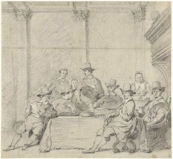 Curator: This pen drawing, "Tekenschool waar naar bekleed model wordt getekend," or "Drawing School Where a Draped Model is Being Drawn," attributed to Bernardino Poccetti, was created sometime between 1558 and 1612. Editor: Woah, a peek behind the curtain! It feels like witnessing a secret society meeting. All those hats, and the focus... Intense. Curator: Indeed. Notice the compositional arrangement. Poccetti constructs the drawing around two key groups: the seated students to the left, diligently working, and the robed figure on the right, presumably the draped model. Editor: And not just 'draped,' shrouded, almost! That figure really dominates the visual space. Though, is it me, or do all the students have the same face? The same, somewhat bored, expression? Curator: Perhaps suggesting a certain conformity within the academic setting. Look at how Poccetti utilizes line quality. Observe the rapid, sketch-like lines used for the background compared to the more deliberate, refined strokes defining the figures themselves. This helps to emphasize the subjects. Editor: It's almost cartoonish, the way he exaggerates those gestures, the slightly slouched posture of some of the artists... it breathes a lively energy into what could be a pretty static scene, a bunch of blokes drawing. What's your take on why the artist chose such basic material for an advanced class? Curator: The choice of pen and ink underscores the primacy of drawing as the fundamental basis of artistic training during the Renaissance. It represents a return to first principles, prioritizing form and structure over color. Editor: Very practical! A bit like forcing guitar students to learn scales before letting them wail on the pentatonics. I like the simple approach in such a complex artistic, social period. Makes the craft accessible. Curator: Precisely. And that accessibility is communicated even today. Editor: Absolutely. I’m seeing new beauty here that escaped my eye before our chat. What about you? Curator: Its formal rigor still impresses. Let's proceed.