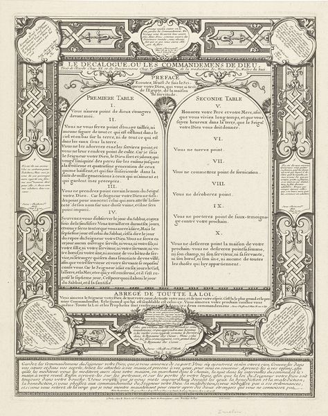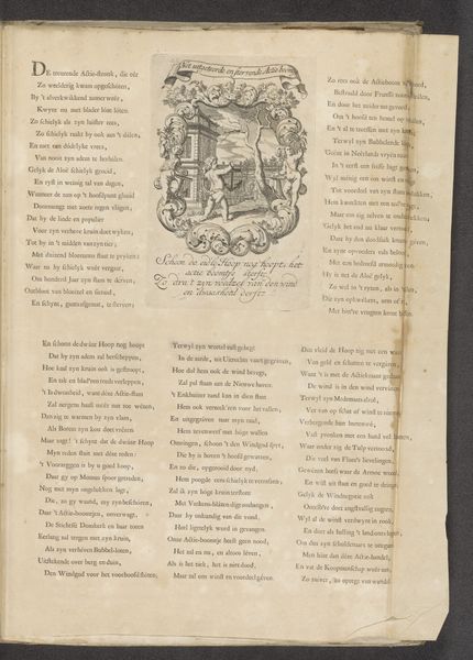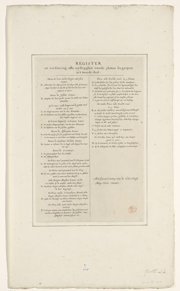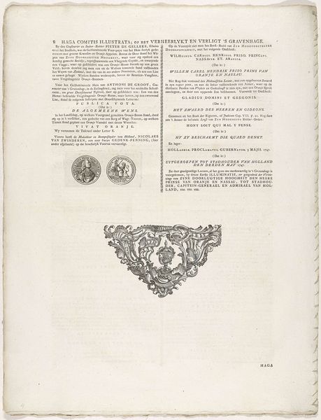 Curator: Here, we're looking at "Laatste blad in: Haga comitis illustrata; of het verheerlykt en verligt 's Gravenhage, 's-Gravenhage 1751," an engraving from 1751, held at the Rijksmuseum. It's quite a piece of baroque artistry! Editor: My immediate feeling? Intricate, formal, and ever so slightly… overwhelming. There’s a lot going on visually, it seems very focused on civic pride. All those densely packed words! And it has such an official feel. Like a proclamation, almost. Curator: Exactly. Notice the layout. The calligraphy isn’t just decorative. Look at the text around those medallion portraits. These are strategic visual elements invoking legitimacy, linking power, prestige and history. The Baroque period loved this kind of display – power justified through visual rhetoric. Editor: Those medallions… One's a portrait, the other looks almost astronomical with lines pointing in different directions. There's some beautiful flourish along the bottom too. It does feel like looking at the foundations of a city’s identity, all laid out in careful script and symbol. Curator: The portrait likely symbolizes the ruling figure, drawing a direct line to leadership. And the sundial signifies time, progress, and perhaps even destiny—a visual language of order and prosperity. Consider this image functioning as civic theater, designed to communicate specific ideals. It attempts to cement a sense of shared identity and heritage. Editor: And the language itself! The text, even without fully understanding the old script, creates a sense of importance. Words have always had magic but with the typography alone, there's this undeniable sense of legacy, the power of the state to declare its own significance and hope to etch that image into the popular conciousness forever. Do you feel any irony thinking about our modern-day graphic design and its relationship with the state or brands and marketing in that regard? Curator: That is very astute; propaganda through graphics, that aims to permeate the zeitgeist and collective mind of citizens; there is little difference other than the techniques have adapted through technological progress. And, in this period in 1751 the artistry was as persuasive as ever! Editor: Thinking about all this makes me look at it differently; less chaotic now; more like a carefully constructed performance. All designed to project stability. Curator: A very carefully designed performance indeed. Visual emblems act as time capsules carrying loaded political ideas that still reverberate today. Editor: So it’s like looking into a mirror reflecting back to ourselves. Maybe less overwhelming and just… human after all.