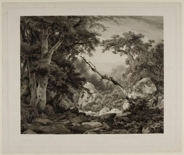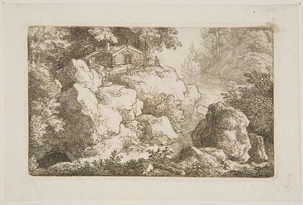 Curator: This etching is by Ferdinand Kobell, born in 1740. It's titled "Herdsman Tending Goats, Sleeping on the Ground." Editor: Ah, pastoral bliss! The delicate lines create such a dreamy, almost ethereal atmosphere. There's a real sense of stillness in this landscape. Curator: The composition is interesting; Kobell uses the cluster of goats and the sleeping herdsman as a sort of central anchor. Then the trees and clouds form these soft, enveloping shapes. Editor: Yes, and the contrast between the active, textured sky and the quiet, almost flat ground plane is striking. It really enhances that feeling of profound rest. Curator: I find it fascinating how Kobell uses such minimal detail to suggest a whole world. The etching medium lends itself beautifully to this sort of understated charm. Editor: It's true. It's like he's capturing a fleeting moment of tranquility, a little slice of Eden before the world got too loud. A reminder, perhaps, that sometimes the greatest wisdom comes from simply lying down and listening to the world breathe.