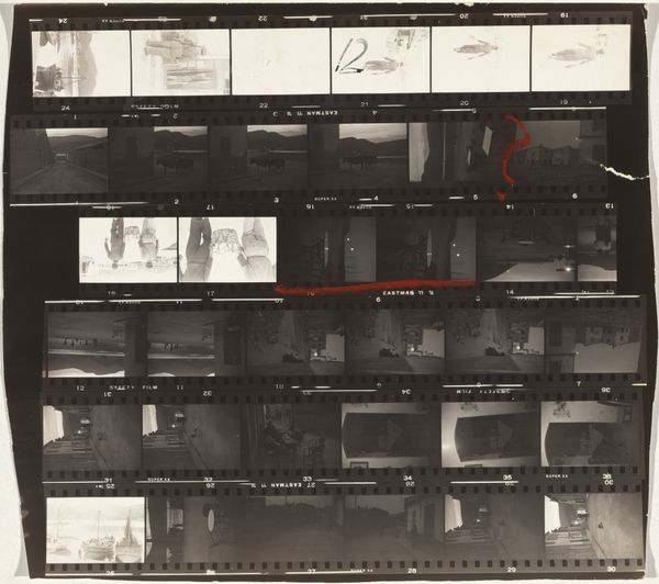 Curator: Immediately, I feel overwhelmed. It's this avalanche of tiny, repetitive frames, a bit dizzying. It’s chaotic and strangely…sad? Editor: This is "Goodbye Mr. Brodovitch I'm Leaving New York, December 23rd, 1971 OK?" by Robert Frank, a gelatin-silver print made in, well, 1971. What you're sensing is potent stuff. He seems to be reflecting on ending one chapter, anticipating…something. Curator: Brodovitch! Alexey Brodovitch was this legendary art director. These repetitive frames…they almost look like strips of film, like film editing contact sheets or storyboards! It is sad—it’s a visual goodbye. It feels abrupt, unfinished, yet so deliberate. The man’s pulling up stakes! Editor: Exactly. Look at the words interjected. They disrupt the visuals, words and single frame photos repeat: CANADA and then YOU or WORDS. Then, these clocks keep reappearing throughout, along with a haunting single face… Do they signify some kind of urgency, an attempt to arrest time maybe, before he… leaves? Curator: That's precisely what is getting me, right here... He's leaving his creative father figure. And all of those…CANADA banners? Is that the next step? Those words: they're not grand declarations, they are really conversational. "Okay?" I mean, the dude even asks, he doubts even this goodbye… Editor: Brodovitch ran *Harper’s Bazaar*. He promoted sharp photography, experimentation. It feels that Robert Frank’s laying bare this creative dialogue to the viewer and bidding adieu. The starkness in printing almost underlines its urgency—this is about letting go of mentorship, of a creative space…The photograph reads as cultural artifact now, though; you wonder, what mark this person left that merited it as worthy of recording. Curator: So it really becomes an homage and perhaps… the pressure that such an inheritance conveys... Frank, as an icon of that style of gritty photography…was free to leave that position behind. Brodovitch, the guru, is held within that position forever. He can’t move on. The visual weight is immense…and Robert? The genius went off to experiment even more freely! That little “OK?” feels lighter now, an opening, not an ending. Editor: What initially seems fragmented resolves into a meditation on influence, place, and saying farewell—though even that act, saying farewell to influence, comes at a great creative, spiritual and existential price. Curator: Yes. The freedom of new beginnings can sometimes begin from the acknowledgement that those beginnings are now needed more. This isn't goodbye to place; it's a launch, via snapshot, into parts unknown.