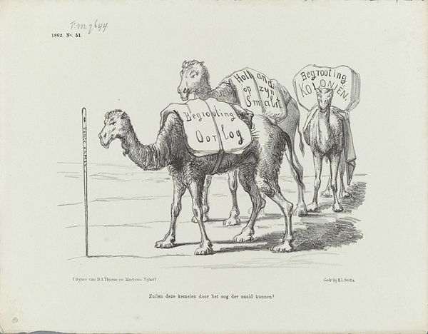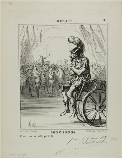 Editor: This lithograph by Honoré Daumier, titled *In the Orient, an Exchange of Diplomatic Notes*, presents a rather aggressive interaction. What's your take on the social commentary embedded in this piece? Curator: This image, likely created during a period of intense colonial expansion, offers a critical perspective on the power dynamics between the West and the East. Consider the exaggerated features and expressions—how do they play into orientalist stereotypes and justify imperial agendas? Editor: I see what you mean. The caricatures are quite striking. Curator: Exactly. Daumier uses satire to expose the arrogance and inherent biases within these diplomatic exchanges. It's not just about the notes being exchanged, but the unequal power relationships at play, wouldn't you agree? Editor: Absolutely, it's a stark reminder of how art can reflect and critique historical injustices. Curator: Yes, and hopefully spark conversation. It's a testament to Daumier's ability to use art as a form of resistance.