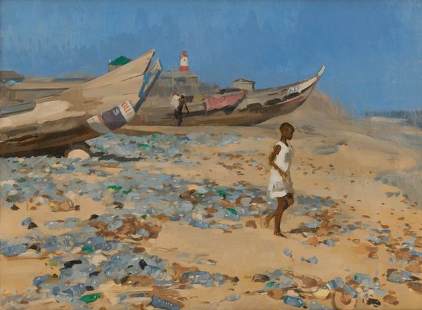 Neale Worley’s painting captures a Gambian beach scene with vibrant local boats, rendered in oil paint. Worley, born in 1962, likely encountered such scenes during travels in West Africa, an area marked by a complex history of trade, colonialism, and cultural exchange. The painting offers a glimpse into the everyday life of a community whose identity and economy are closely tied to the sea. The boats, adorned with colorful designs, are more than just tools; they’re a canvas reflecting the cultural aesthetics and individual stories of their owners. The figures on the beach, perhaps fishermen or traders, embody the human element of this maritime culture. They are silhouetted, but still communicate a sense of self-assuredness. The gaze shifts towards the sea, a poignant reminder of the interconnectedness of identity, environment, and history.