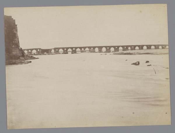 Curator: This is a photograph titled "Solani Aquaduct bij Roorkee", dating to before 1867, by Thomas George Glover. It’s an albumen print. Editor: There’s something melancholy about this image, isn’t there? The muted tones, the seemingly endless stretch of the aqueduct...it feels almost desolate. Curator: That might be the effect of time on the albumen print itself; it has definitely aged. But there's also the context. The Solani Aqueduct was an ambitious feat of British engineering in India, designed to irrigate the Doab region. So, we're seeing a landscape transformed by colonial intervention. Editor: Right, and that explains the unsettling feeling! The aqueduct imposes itself on the natural landscape, straight and unwavering, while everything around it fades into the sepia tones of the past. Almost like a memory, both grand and ghostly. Curator: Precisely. And Glover's choice to capture it in this light further complicates our reading. The aqueduct wasn't just about irrigation; it was about power, control, and the imposition of a Western vision on the East. Photography at this time was also a tool used for colonial documentation and asserting dominance. Editor: So the desolation isn’t just an accident, or an effect of the aged print, but perhaps woven into the very fabric of the image itself? Like a statement about the long-lasting implications of altering landscapes for specific political ends. Curator: It makes me wonder about the unseen stories, about the laborers who built this massive structure, about the local communities whose lives were reshaped by it. Editor: It definitely holds a space for unseen stories. I'm suddenly thinking of water, as sustenance and resource, both gift and weapon. Perhaps what feels unsettling comes from the visual of such large quantity of water brought from a distance, away from its source, against its natural pathways. Curator: Food for thought, indeed. It's a testament to how even seemingly straightforward documentary images can hold layers of complexity and invite reflection on power, progress, and the indelible mark we leave on the world. Editor: It feels as though viewing the image also demands a degree of sensitivity. We must become acutely aware of the power that each landscape possesses to spark conversations about historical and contemporary challenges, and the legacy that persists for so many, for better or worse.