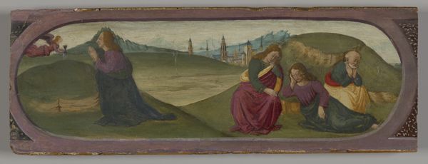 Neri di Bicci created this small panel painting of "The Archangel Raphael and Tobias" in the 15th century, and it now resides in the Metropolitan Museum of Art. It's remarkable how the artist balances the ethereal with the earthly within such a compact space. The composition strikes a delicate balance between symmetry and asymmetry. Raphael and Tobias, rendered in soft, muted colors, walk towards the left, yet their figures are carefully placed to engage both halves of the panel. Note the contrast between the solid, grounded figures and the flat, patterned background, filled with stylized stars. The archangel's wings, though meant to suggest flight, are heavy with detail, anchoring him to the ground. This juxtaposition of the divine and the mundane is further explored in the subdued palette, which softens the symbolic weight of the scene. Di Bicci uses line and form to create a space that is both reverent and intimately human, inviting us to contemplate the intersection of faith and everyday life.