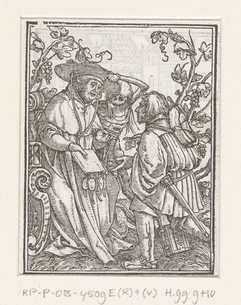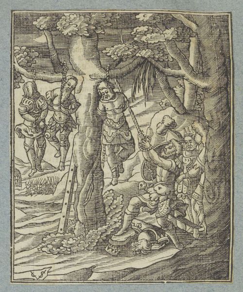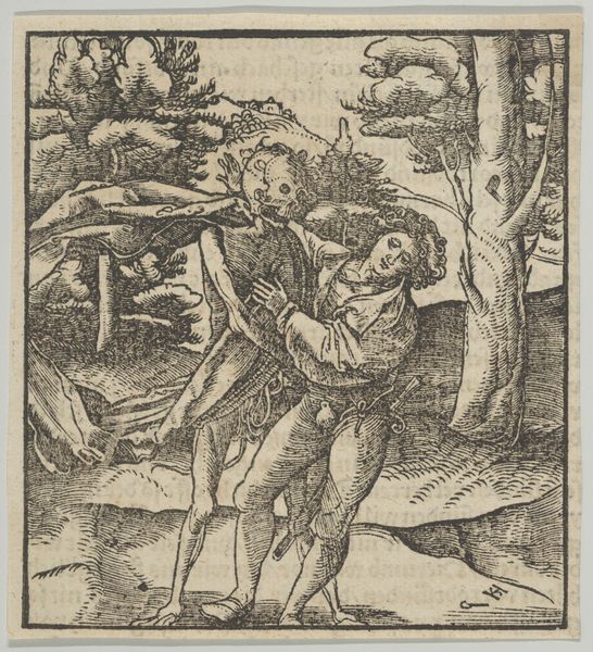 Editor: This print, "Three Children with Trophy" by Hans Holbein the Younger, made in 1547, features delicate engraving. There’s something quite peculiar about the imagery—children amidst symbols of war and triumph. What social commentary might Holbein be offering us here? Curator: Indeed. Holbein worked in a world saturated with political and religious tensions. Considering that he created art for powerful figures, we might interpret these children embodying the legacy—or perhaps even the burden—of political ambition. The trophy, a classical suit of armour, seems far too large for them. Editor: So, these symbols aren't necessarily celebrating military victory? Curator: Not necessarily. In this print, Holbein subverts the conventions of triumphal imagery by placing children at the center. Is it meant to humanize conflict or to underscore its absurdity when passed down to future generations? What message would you imagine viewers at the time receiving, knowing full well the bloody history and present tensions of the period? Editor: I see what you mean! Perhaps viewers would question the true cost of conflict, and wonder who actually benefits. Placing children at the fore encourages such contemplation. Curator: Exactly. The image forces us to confront the socio-political climate of the 16th century. Art rarely exists in a vacuum. Editor: I now have a greater understanding of the layers of cultural and political significance embedded in what first seemed like a quaint, historical piece. Thanks for pointing that out. Curator: The role of art is always interwoven with social history, if you only know how to look at it.