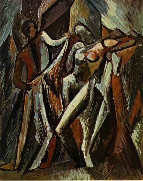 Editor: Here we have Max Beckmann's "The Descent from the Cross," painted in 1917 using oil paints. There’s a real sense of angst communicated through the distorted figures and muted palette. What strikes you most about this composition? Curator: The immediate element commanding attention is the compressed pictorial space. The figures, seemingly crammed together, lack conventional modeling, resulting in an unsettling tension. Note also Beckmann's departure from traditional perspective. The foreground and background are flattened, collapsing the scene into a single plane of emotional intensity. Editor: Yes, the flattening gives it this claustrophobic feel. How does that stylistic choice contribute to the overall meaning? Curator: By negating depth, Beckmann forces the viewer to confront the emotional immediacy of the scene. Observe the stark contrasts in light and shadow which further heighten this effect, contributing to a sense of unease and instability. Consider how the interplay of these formal elements reinforces the theme of suffering and sacrifice. Editor: I hadn't considered how the formal aspects create that specific feeling. It's more than just the subject matter. Curator: Precisely. Beckmann uses form to amplify the emotional resonance. How do you interpret the use of color within this framework? Editor: Now that you point it out, I see that the color palette contributes to this oppressive feeling. Seeing how those choices underscore the work is fascinating. Thank you. Curator: Indeed. The formal analysis provides entry to the artwork; it’s rewarding to look at the color relationships.