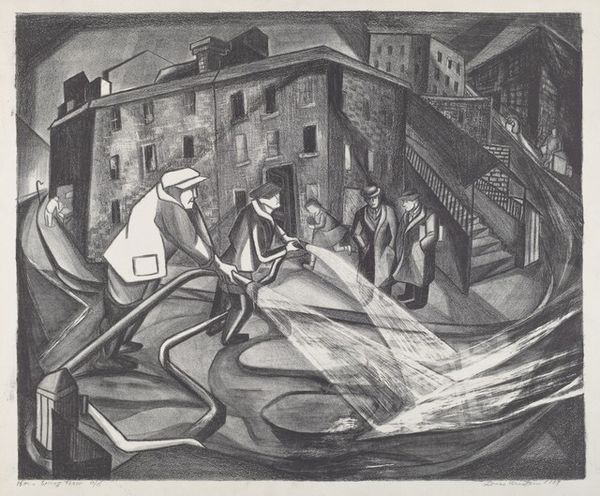 Curator: This is Riva Helfond's "Protest," a compelling print believed to have been created sometime between 1935 and 1940. Editor: My initial sense is that this image feels deeply somber. The stark black and white, combined with the dense crowd, evokes a feeling of tension and unrest. Curator: The composition is quite striking. Notice how Helfond employs sharp contrasts in tone to guide our eye, leading us through the layers of figures. Semiotically, the raised flags and the slumped figure being carried suggest themes of patriotism and sacrifice. Editor: For me, the materiality speaks volumes. Given the probable era, I’m thinking about the labor required to create a print like this, and the kind of person that would invest the time in this process given what it is showing. I suspect it might point towards a profound engagement with labor rights. Curator: Yes, there’s definitely a dialogue with social realism here, reflected in its figuration and attention to urban space. The perspective flattens, amplifying the expressive quality. You see hints of Expressionism here as well. Editor: I agree. Consider the production of paper in the 1930s. Access to quality materials would have been far from guaranteed. Every sheet would represent resources and labor—a powerful thought when observing a work of this nature and scale, and seeing it focus on this street scene. Curator: Its engagement with narrative conventions associated with history painting, typically grandiose, becomes very interesting when presented on such a potentially widely distributed medium like print. It brings the themes of protest closer to the public. Editor: I find the contrast between the lifeless figure being carried, versus the seeming passion from the other participants, particularly engaging, prompting us to really consider labor issues through these materials. Curator: The work leaves us contemplating not only the social conditions Helfond depicts but also the role of art itself as a witness and agent of social change. Editor: Ultimately, examining the physical processes reminds us how materials and actions, like protesting and printing, embody both artistic expression and political intent.
