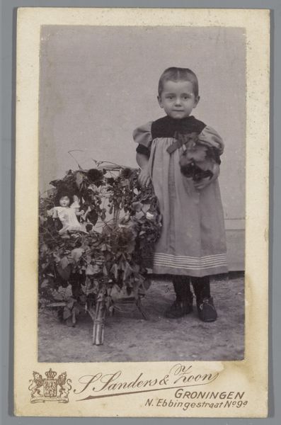 Curator: Here we have a photograph by Sarah Choate Sears, known as “Helen Sears (with vase of lilies).” Editor: It's striking; the way the bright lilies compete with the child's face, almost as if questioning traditional portraiture. Curator: Sears moved within elite artistic circles, exhibiting internationally. This work gives us insight into her strategies, perhaps even challenging gendered expectations of photography at the time. Editor: Indeed, the lilies, often associated with purity, alongside the young Helen, presents such layered symbolism about innocence and identity. Curator: Considering the era and Sears' position, the photograph suggests more than just a charming portrait; it comments on the public role of women and children. Editor: I agree. It's a powerful, if subtle, commentary, and reflecting on the social constructions that shape how we view each subject offers a deeper experience with this intimate piece.