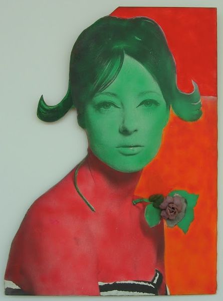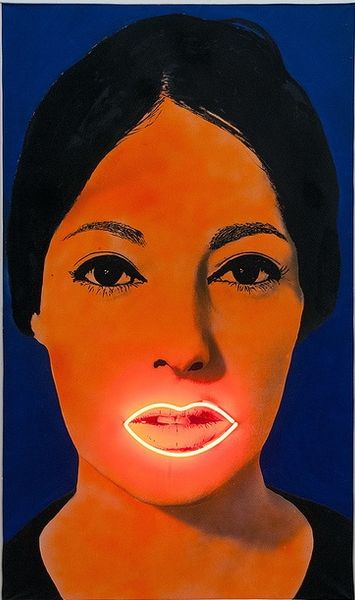 Curator: Martial Raysse created “Nissa Bella” in 1964, using mixed-media that includes acrylic paint to achieve this startling Pop Art portrait. Editor: Striking. The clashing orange backdrop against the almost sickly green skin tone...it's immediately unsettling, then you spot the neon heart and it adds another layer of almost sarcastic sweetness. Curator: Yes! The heart symbol resonates so strongly; consider the countless depictions throughout art history, from medieval tapestries to contemporary graffiti. Raysse is consciously playing with that visual language. He knows we are primed to respond emotionally to that form. Editor: And using neon—a very modern, commercial medium—shifts that sentimental weight, doesn’t it? It's almost like love sold as a commodity, fitting into that consumerist critique so prevalent in Pop Art. The portrait becomes almost dehumanized under that cool, glowing heart. Curator: Perhaps. Or is he hinting at the enduring power of love, even within a rapidly changing, commercialized world? The neon suggests resilience, an almost defiant optimism persisting despite the artifice of modern life. The bright electric light becomes an undeniable emblem, pasted directly onto the image. Editor: That resilience feels a little fraught given the social context of 1964. Considering second-wave feminism’s emergence and the political turbulence around race and civil rights... That “beauty,” framed by the coolly detached heart, feels less like hope and more like a hollow promise. Curator: It’s a fascinating tension. It feels both of its time and speaks to a timeless yearning, like an early Byzantine icon but rendered in the visual language of advertising. A halo reframed for the modern era? Editor: Maybe. I still see it as a pointed commentary. But it certainly gives us a lot to unpack regarding beauty standards, commodification, and the complex emotional landscape of the 1960s. Curator: Exactly. Raysse invites us to re-evaluate those persistent symbols—hearts, beauty—in our own contexts. Editor: Well, it definitely sparked some lively debate! Hopefully, visitors find something to engage with on their own terms.