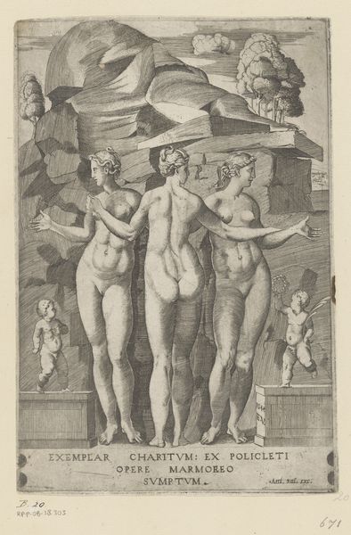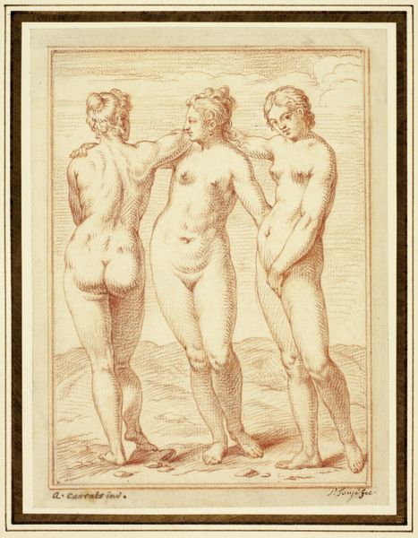 Editor: Here we have "The Three Graces," an engraving by Agostino Carracci from around 1590 to 1595. The figures seem almost interwoven, their connection emphasized, yet I'm curious about the choice of this specific artistic approach. How do you interpret this work? Curator: This piece offers an opportunity to explore the representation of female bodies and beauty ideals through a critical lens. Carracci presents a canon influenced by classical sculpture, which perpetuated certain notions of beauty but what were the contemporary expectations on the women themselves at the time? Consider also the power dynamics inherent in the male gaze prevalent during the Renaissance; it reflects broader societal power imbalances that positioned women as objects of admiration. How does the choice of engraving as a medium impact your understanding? Editor: That's insightful! As an engraving, it's accessible, reproducible. Was Carracci making a statement about democratizing beauty? Curator: It's a pertinent point to consider. Reproduction and distribution also determine whose vision gets shared, and thus, whose voices dominate. To broaden the analysis, examine how the “Graces” embodied contemporary expectations of women: were they supposed to be beautiful, but silent? Passive, yet inspiring? It is useful to interrogate the implications behind their gazes, poses, and interactions, and what statements it makes about the artists' assumptions of female relationships at the time. What complexities do you notice? Editor: I see… so it’s about looking beyond the surface to see the dialogue, or perhaps the power struggles, embedded in the work? Thanks, it's helpful to see art through that context. Curator: Precisely! When you bring contemporary and historical theory into art analysis, one begins to explore an exciting range of narrative possibilities.