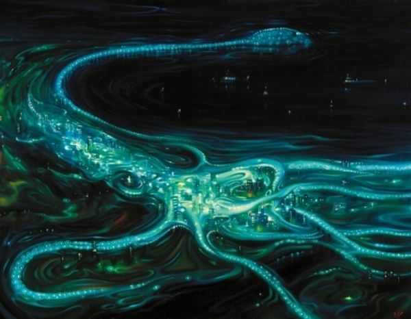 Curator: Editor: Abdul Mati Klarwein’s "Landing Strip," created in 1984 with mixed media, presents this fantastic landscape with incredible detail, almost like a microscopic view. It feels very surreal and dense. What do you see in this piece? Curator: For me, it is precisely the artist's choice of mixed media that intrigues. How does the selection of paint contribute to the portrayal of what appears like an organic structure, maybe some giant leaf? It pushes against any simple "naturalistic" label; the meticulous technique calls attention to itself, foregrounding the constructed nature of this world. What do the marks, and how they're made, tell us about production and the artist’s labor? Editor: That’s a good point. Looking at the way he layers the materials, especially how the lines create such a distinct texture, it definitely makes me think about the act of making and labor. Does this speak to his other works? Curator: Exactly. Consider Klarwein's broader artistic context, his album covers, and psychedelic imagery. His labor isn't just the solitary artist; he's involved in the commercial art world. Does “high art” mean less artistic work than what an artisan might engage in to get paid for their art or service? I want you to think about where he got his canvas, what tools he is using and for how long. Editor: That's interesting, the connection to the commercial art world makes me consider who this piece was made for. I see the value of appreciating the materials used. I can see what’s intended to look “organic” really is, materially, artificial in so many ways. Curator: Right. By focusing on the physical and social elements that underpin it, you go beyond just seeing this as representation of an idyllic spot. Think of how landscapes are made, extracted and used! Editor: I hadn’t thought about that until now. Thanks for shedding light on the role of materials and context in understanding a painting like this! Curator: Indeed. Considering the materiality alongside artistic vision allows for richer and socially informed encounters with art.