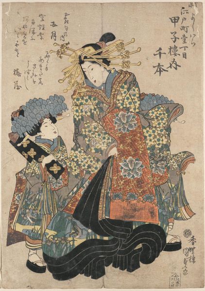 Curator: Here we have "Standing Beauty in a Dance Pose" by an anonymous artist. The work is a painting proper, and what immediately strikes me is its graceful, almost ethereal quality. Editor: Indeed, the dancer's pose suggests a fleeting moment captured in stillness. I'm drawn to the interplay between the bold patterns on her kimono and the delicate rendering of her face. Curator: Note how the flat planes of color create depth. The composition is carefully balanced, guiding the eye from the text at the top to the dancer's feet. There's an intriguing tension between the figure and the ground. Editor: I wonder, what story does her attire tell? The maple leaves and plum blossoms might symbolize specific seasons or social affiliations. It could also speak to themes of transience and beauty, common in depictions of women in art. Curator: I agree, and the use of line is particularly effective, defining form and movement in a remarkably economical way. Editor: Precisely. The piece encourages us to consider not only the aesthetic choices but also the cultural lens through which we view this subject. Curator: A captivating synthesis of form and narrative, it seems. Editor: Absolutely, a window into a world of aesthetic codes.