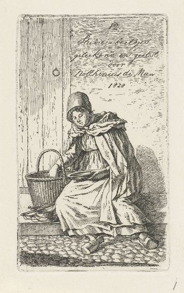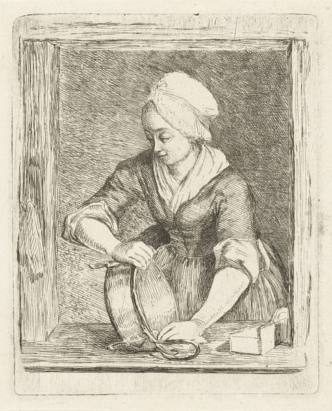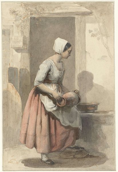 Editor: We're looking at Anthony Oberman's "Keukenmeid," made sometime between 1796 and 1845. It's a pencil drawing, and it feels so intimate, like a fleeting glimpse into someone’s private life. What do you see in this piece? Curator: It’s precisely that intimacy which resonates. Look at how the light falls, suggesting domestic routine, and consider the layering of objects: the pail, the bowl, the window implying the outside world, yet contained. What does this containment suggest to you, culturally? Editor: Maybe the restrictive role of women during that period? The 'keukenmeid', or kitchen maid, confined to the domestic sphere. Curator: Precisely! The cap itself becomes a symbol – a signifier of servitude, of station, not unlike a halo denotes sanctity. It’s an echo of societal expectations embedded in the everyday. And note the texture, how it softens the rigidity of the lines. It prevents the image from being austere and creates a gentle mood, evoking memory rather than rigid reality. Editor: So the medium itself reinforces the message? That the sketch-like quality conveys a sort of...ordinariness that contrasts with those strict societal expectations? Curator: It creates a quiet defiance, almost. There’s beauty and dignity in this common labor. By capturing this simple scene, Oberman elevates it. What do you think the inclusion of the hat hanging on the wall adds? Editor: Maybe the hope for a different life? Or a day outside the kitchen. The details definitely feel significant. Curator: And are significant, building layers of meaning. This simple sketch unlocks a complex cultural narrative. Editor: I’ll never look at a pencil sketch the same way again. It's amazing how much can be read from an ordinary image, once we begin to think about the embedded meaning. Curator: Indeed. It demonstrates that art can be a potent mirror reflecting societal values, captured in the most unexpected of places.