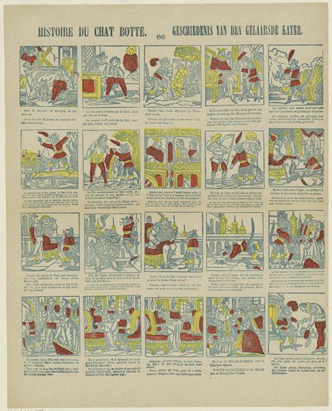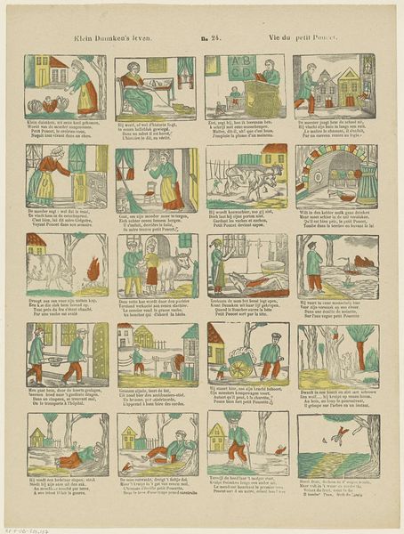 This illustrated broadsheet, *Lammen goedzak / Le bon Guillaume,* was made by Philippus Jacobus Brepols in the early 19th century. It’s a woodcut printed on paper and then colored, a relatively low-cost means of production that allowed for mass distribution. The simple, graphic style has a folksy charm, but also speaks to the economics of printmaking at the time. Each image is a vignette depicting scenes from everyday life, presented in a grid. The strong lines and flat areas of color are typical of woodcut, where the artist carves away the negative space to leave the design raised. This allowed for multiple impressions to be pulled quickly, meeting the demand for affordable printed material. In its time, the image would have been seen as disposable, but now it gives us a direct connection to the visual culture and the economic realities of the early 1800s. It’s a fascinating example of how materials, making, and social context come together in a single artwork.