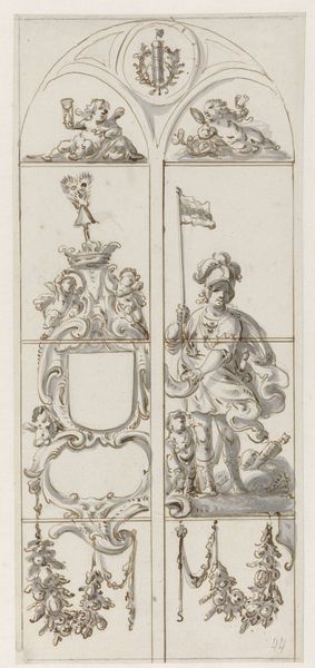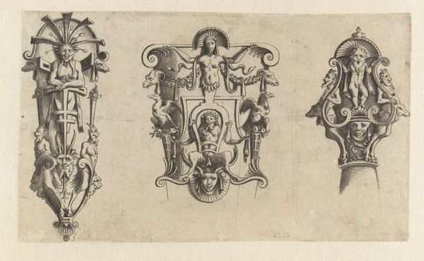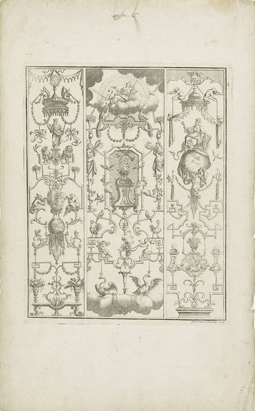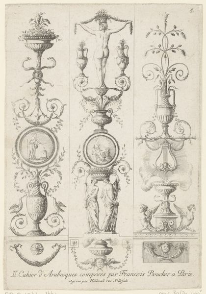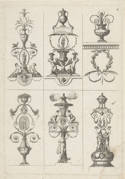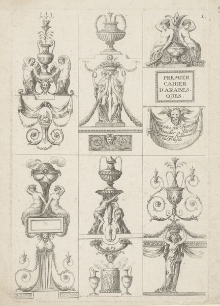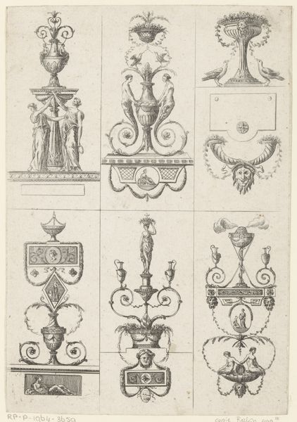 Editor: This is "Vijf scènes met arabesken," or "Five Scenes with Arabesques," an engraving dating from around 1746-1800, currently at the Rijksmuseum. The flowing lines and classical figures give it a very elegant, almost dreamlike quality. What strikes you most when you look at this work? Curator: Immediately, I see a dialogue between classical ideals and a burgeoning Rococo sensibility. The figures themselves are borrowed from antiquity, but the extravagant ornamentation, the playful asymmetry... It suggests a cultural memory grappling with new aesthetic freedoms. Where do we find lasting meaning: in tradition, or embellishment? Editor: That’s fascinating. It’s like these rigid structures are being softened by the flourishes around them. Curator: Exactly! Think of the symbolic weight of each element. The vases – vessels of containment and potential – contrasted with the spilling abundance of the floral arrangements. What do these motifs communicate about control versus liberation? About mortality and everlasting aesthetic values? Editor: I hadn't considered that level of symbolic contrast. So the flowers bursting out of the vases represent… something breaking free? Curator: Perhaps, or perhaps an eternal, cyclical return. Rococo often used nature in this way - idealized and tamed, a nostalgic projection of an Arcadia ever-lost and yearned for. The arrangement evokes feelings, and that becomes a value to the beholder. Editor: I see now. This isn't just pretty decoration; it's a conversation about history, beauty, and emotion, encoded in symbols. Thank you! Curator: And thank you! Art offers a rich trove of memories, accessible across centuries through sustained viewing, attention to symbols, and active listening.