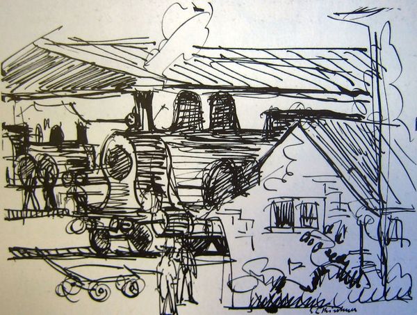 Curator: Ernst Ludwig Kirchner's ink drawing, "The Railway Overpass," dates back to 1914, a time when Germany, and Europe in general, was rapidly changing. Editor: Wow, talk about raw energy! It feels almost frantic, like a city buzzing on too much caffeine. The stark black ink... it's like he's carving the anxiety of modern life right onto the page. Curator: Indeed. This piece offers a glimpse into Kirchner's engagement with urban spaces, a recurring theme in Expressionist art. The railway itself can be interpreted as a symbol of industrialization, but it also underscores how deeply that concept can penetrate the cultural conscious. Editor: Oh, definitely. And it's not just the subject, it's *how* he renders it. That jagged, almost violent linework? It's practically screaming about the alienation of the individual amidst the machinery of progress. Gives you the shivers, doesn’t it? Curator: It reflects, too, a period marked by increasing social fragmentation. Traditional social structures were collapsing, creating new anxieties around identity and community that are reflected here. Editor: Right, you can almost hear the rumble of the trains and see the city folk scurrying about beneath this big overpass. Sort of reminds me of when I got lost in Tokyo! All these visual layers. Like an intense fever dream in ink. So chaotic, yet somehow...captivating. Curator: Expressionism as a whole frequently grappled with themes of social unease and sought to externalize inner emotional states. "The Railway Overpass," viewed through the lens of gender studies, also hints at masculine spaces and their influence on identity formation. Editor: See, for me, it hits on the fragility, the transient nature of it all. Like everything could collapse at any moment. Maybe that's just my doom-and-gloom artist brain talking, who knows? Curator: Well, Kirchner’s era was teetering on the edge of enormous social shifts. His artistic choices were radical for their time. Editor: I still wonder where Kirchner was mentally. "The Railway Overpass"...more like the anxiety superhighway, right? Anyway, thanks for walking me through it. Now I'm gonna go listen to some very calming whale sounds. Curator: I found this dialogue truly inspiring. Hopefully listeners, you can appreciate Kirchner’s drawing on a deeper, personal level too.