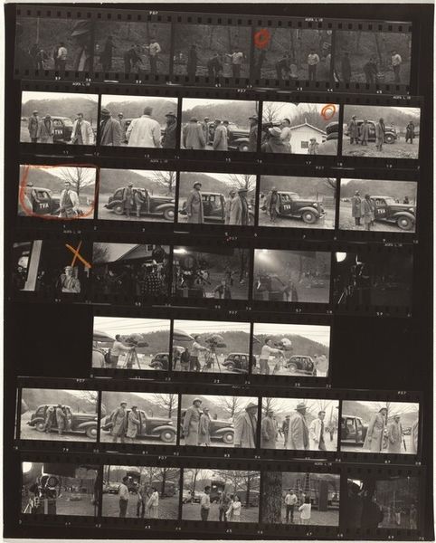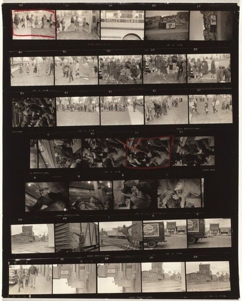 Editor: We're looking at Robert Frank's "Saint Patrick's Day Parade—New York City 1," a gelatin silver print from 1958. The contact sheet format gives us multiple perspectives, almost like a storyboard. What is it that speaks to you the most from a historical point of view? Curator: The parade isn't simply a celebration; it's a performance of identity within the complex social fabric of 1950s New York. Frank captures this not just through the marchers, but also in the context of the urban environment. Look how the architecture frames the procession. It emphasizes the institutional power present alongside the celebration of Irish-American heritage. Editor: That’s a really interesting observation, the imposing buildings looming above. So it is less about just one event? Curator: Exactly. Ask yourself: who gets to participate, who gets to watch? The composition draws attention to these questions, and that reflects on urban power structures. What about the choice of shooting in a contact sheet? Editor: It seems less curated than a single image would be, right? More raw. Curator: Precisely. It echoes Frank's break from traditional photojournalism. This allows a deconstruction of the spectacle, revealing layers of social interaction and representation. It critiques the staged performance of identity inherent in such events, questioning the viewers relationship to spectacle. Editor: That's fascinating. I’d initially seen it just as a documentation, but the layering adds much more context. Thanks for sharing! Curator: Indeed. Art constantly makes the viewer think, lets expand these concepts!