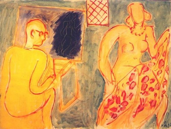 Curator: This woodcut is titled "Hungarian Dance," created by Ernst Ludwig Kirchner. What are your immediate impressions? Editor: It strikes me as a frenetic and raw depiction, like a captured moment bursting with life. The color palette is stark, with this dominant golden yellow against the harsher black and red of the figures, amplifying the feeling of unease beneath the supposed gaiety. Curator: Exactly, look at the interplay of jagged lines, especially how they carve out the figures. Kirchner has this incredible ability to distill the essence of movement into simplified forms, it's Expressionism in its purest manifestation. The visual dynamic is striking. Editor: Speaking of figures, I can't help but feel drawn to their costuming. The central figure appears in some sort of theatrical getup. Is this evoking traditional folklore, maybe even pointing to a sense of cultural preservation or a yearning for authenticity in the face of modernity? Curator: That’s certainly one reading. Kirchner’s fascination with the “primitive” is well-documented, and the figures certainly lean toward stylized depictions. He's less interested in accurately portraying bodies, though. The elongated limbs and angular poses amplify emotion. The overall composition seems almost purposefully off-kilter, destabilizing any sense of balance or ease. Editor: Do you think this distortion might express something darker about early 20th-century anxieties? There's that clashing imagery of gaiety mixed with darker themes which might express an uncomfortable relationship with traditional forms. Curator: That seems accurate, he was clearly grappling with this tension between modern life and this urge to return to something foundational. He employs graphic contrast to signal some cultural divide. Note, however, that we don't actually have evidence about when the artwork was made. It has no associated creation date! Editor: So maybe that sense of instability is his means of interrogating it? Well, regardless of its inception date, I find that reading the piece is valuable! Curator: Yes! Through these abstracted figures, he reveals a subjective interpretation, almost a raw, uncensored emotional experience distilled into form. Thank you for this conversation. Editor: Thank you.