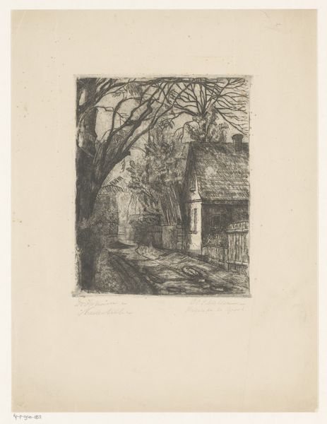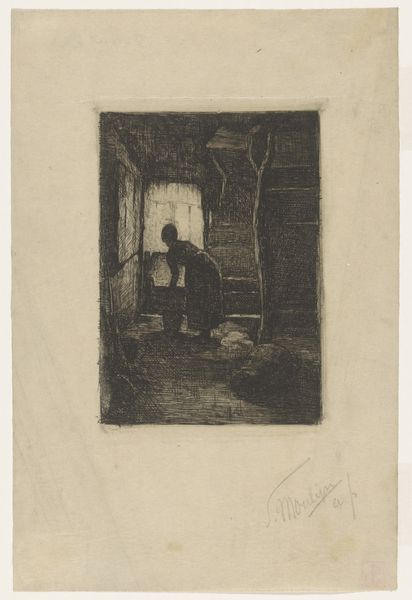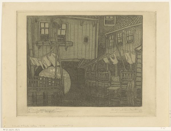 Curator: I'd like to introduce you to "Gezicht in een schuur met boerenwagen in Kalevoet," or "View in a Barn with a Farm Cart in Kalevoet," an etching made around 1897 by Pol Craps. It's currently held at the Rijksmuseum. Editor: My first impression is of a somewhat claustrophobic space, yet one filled with the simple poetry of everyday life. The light, although muted, seems to highlight the textures. Curator: Indeed. Craps’ use of etching is quite meticulous. Look closely at the barn's roof, the density of those lines suggests the age and the material of the building. And then there's the deliberate rendering of the hay bale, seemingly to underscore its function in a pre-mechanized farming existence. Editor: The placement of objects certainly feels deliberate, doesn’t it? That barrel by the doorway could represent abundance, while the wheel of the cart symbolizes a cyclical turning point or inevitable change inherent in agrarian life. Curator: Don’t forget the window with hanging lantern. It could also represent the dim light and harsh realities that often characterized rural existence. Etchings, being prints, enabled the broader distribution of such narratives – the working class reflecting upon itself. Editor: I think your emphasis on materials is fascinating, but my mind gravitates towards how these rustic tools mirror deeper cultural rhythms. A culture intertwined with labor and nature, where such implements, not kings, wielded significance in people's lives. Curator: I completely agree. To fully comprehend it, we can look into the tools to fully comprehend what type of labor and craftsmanship has built their meaning within their lives. Editor: A lovely exchange – connecting tools, textures, light, all tied to humanity and hard work, as they weave us together through symbolism that is accessible to a rural folk. Curator: Precisely. It offers a material reality, etched into permanence, reflective and reflective.