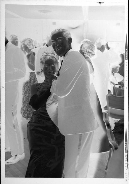 Editor: This photograph, "Untitled (woman hugging younger man)" by Lucian and Mary Brown, looks like a silver gelatin print. It has a tender quality. What stands out to you? Curator: The materiality of the photograph itself is intriguing. The process of capturing and developing this image, the labor involved in its creation and reproduction, speaks volumes about its value as a commodity, documenting a certain social interaction. Editor: I never thought of it that way. So, the process of making the photo impacts its meaning? Curator: Precisely. The chemical processes, the paper, the photographer's choices, all contribute to the final product and its reception within a consumerist society. We must consider how it circulates. What purpose did it serve? Editor: Fascinating. I see how understanding the materials and context enriches the image.