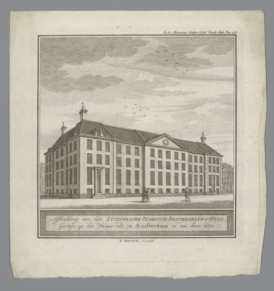 Curator: This is an etching titled "Gezicht op het Nieuwe Werkhuis te Amsterdam," dating back to 1789. The artist is anonymous. It depicts the New Workhouse of Amsterdam. Editor: The Workhouse, seen so formally. It’s all about geometry here. Those tiny people, a lone cow... feel oddly placid. Maybe ominous. There is very light contrast though. Curator: Workhouses served as institutions for the poor, providing them with housing and employment. This etching therefore offers insights into the social welfare systems and urban planning of 18th-century Amsterdam. The artist’s focus on architectural detail gives importance to public institutions and the way they were perceived and presented to the public. Editor: Perceived by whom, I wonder? There's something unsettling about this level of architectural precision – almost sterile. It makes the buildings seem not quite lived in, yet... important. The workhouse dominates the image, symbolizing, what exactly? Control? Refuge? A little bit of both? Curator: Exactly. The location of this depiction within the Rijksmuseum speaks to the evolving status of such institutions. In their time, workhouses like this were expressions of municipal and state control, whereas their role in social reform are contested in the modern museum space. Editor: It's that tension – that very controlled exterior versus the presumed chaos and desperation it contained that I find so intriguing. A very flat rendering though and on aged paper so a strong historical vibe overall. The sky too makes it even more intense with that low level contrast. Curator: The deliberate lack of emotional expression or narrative intrigue typical of the period helps to normalize institutions like the workhouse as simple, and perhaps expected features, of urban life. This way, the viewer will accept their function and be accustomed to them, whether in reality or by way of imagery. Editor: Right. Almost makes you feel like its just “always been there”. It's funny, isn't it? How something created with the intention of, let’s say, societal control can, centuries later, spark such empathy. Maybe all art is just propaganda in hindsight. Curator: It's a fitting observation; art challenges assumptions about both present day structures, and past ones. The power in examining it allows to better assess what the artist presented to begin with. Editor: Food for thought, indeed. Maybe a strong espresso to cut through this weight.