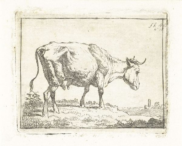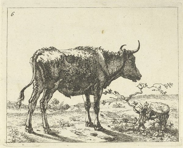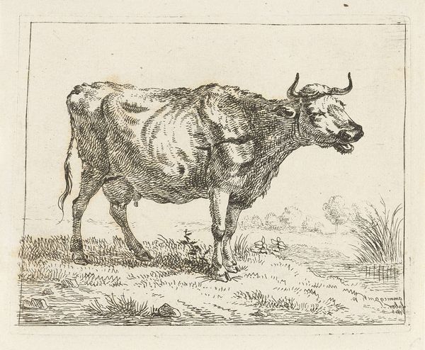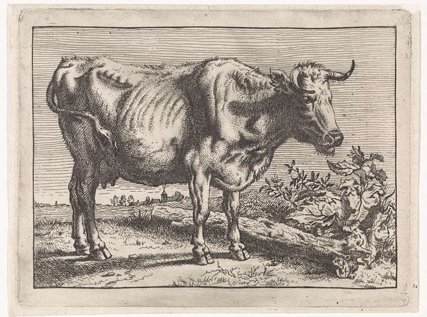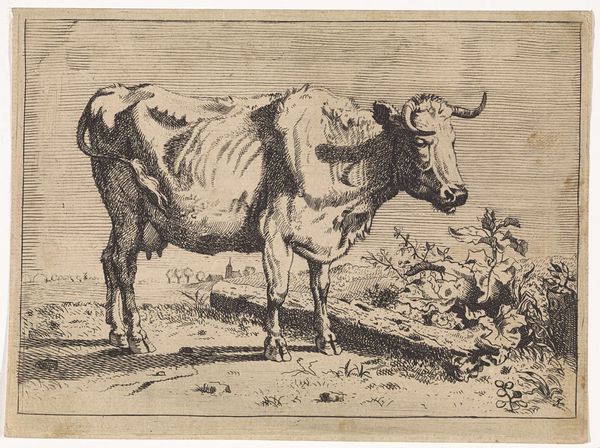 Editor: Here we have Paulus Potter’s "Standing Cow," or, as it's sometimes called, "Cow with a Crumpled Horn," from 1650, done in etching. It’s remarkably…stark. What strikes you most about this depiction? Curator: Oh, darling, where do I even begin? It isn’t just stark; it's startling! It's like Potter grabbed this cow straight out of a Breugel painting and planted her right here. Look at those exquisitely etched lines – they don't idealize; they *reveal*. Can't you almost feel the rough texture of her hide? See how she dominates the landscape, a queen on her humble throne of grass? Editor: Yes, I see that. She seems… unglamorous. Not your typical, idealized animal portrait. Curator: Precisely! That’s Potter’s genius! This isn’t some fluffy pet; it's a working animal. There’s a brutal honesty, a quiet dignity that screams, "I am essential!" Think about it – the Dutch Golden Age wasn’t all tulips and traders; it was built on agriculture, on the backs (and udders) of cows like her. Isn’t there something strangely beautiful in that raw truth? Editor: I guess there is, when you put it that way. I hadn’t considered the symbolism behind the realism. Curator: Symbols are everywhere, my dear, sometimes hiding in plain sight, sometimes wearing a crumpled horn like a crown! That’s the magic of art, isn’t it? Finding beauty in the mundane, revealing the epic in the everyday. Now, go forth and milk that cow for all she’s worth! Editor: Definitely something to think about. Thanks for your insight.