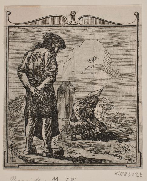 Editor: This is "Rübezahl og Bonden" by Andreas Flinch, a woodcut print from the early 1840s. The contrast is really striking and it definitely has an ominous mood. What strikes you most about this piece? Curator: Immediately, the power dynamic between the figures. We see a figure presenting something to another in what appears to be a subservient posture, and it makes me think about the ways folklore often served as a way to encode social commentaries. How might we interpret this scene in the context of 19th-century class structures? Editor: I see what you mean. The figure on the left does seem to be offering a gift or payment. Do you think Flinch was critiquing those power imbalances, or reinforcing them? Curator: That's the crucial question, isn't it? Given the rise of Romanticism, and its focus on the common person and on nationalist narratives, it could be interpreted as a commentary on the inherent tensions of a society in flux, a time when the traditional rural class found itself increasingly interacting with different kinds of powers, new societal systems. Notice how the use of black and white exaggerates features in each figure, but especially on the right. Why? Editor: The contrast definitely draws the eye! So, are you suggesting that this piece might be using folklore to explore anxieties about social and economic change? Curator: Precisely. And perhaps it even subtly questions who truly holds the power in this encounter. Maybe Flinch is telling us to consider what each side gives, what each takes away... what is 'owed.' What do you think about the landscape? Editor: The landscape does seem to hold them, not the other way around. Thank you, I now see how Flinch is using the narrative to tell a richer story! Curator: And by viewing it through that social and historical lens, we gain a much richer understanding of the piece.
