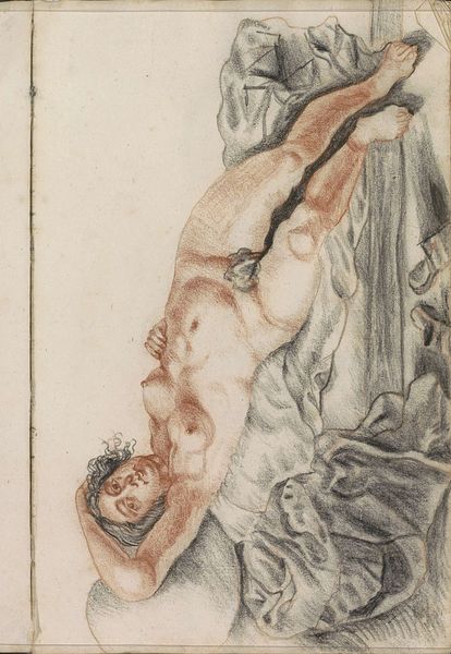 This is a drawing of a crowned nude woman, possibly Juno, by Hendrick van Beaumont. Notice how the figure is oriented diagonally across the page, creating a dynamic yet precarious balance. Rendered in red chalk, her skin contrasts with the drapery sketched in black chalk, drawing our attention to the play of light and shadow across her form. The crown suggests divinity, potentially destabilizing conventional representations of power through its pairing with nudity. Semiotically, the nudity may signify vulnerability or truth, challenging fixed interpretations of classical iconography. Consider how the artist uses line and shading to model the figure. Does it adhere to academic ideals, or does it diverge in ways that question established aesthetic values? Ultimately, the artwork invites us to consider not just the aesthetic qualities but also the cultural codes and philosophical ideas that informed its creation. Art, after all, is never static; it’s a dialogue between the artist, the artwork, and us.
