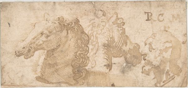 Editor: Here we have Pieter Feddes van Harlingen’s "Three Masks with Horns," created in 1611. It appears to be a pen and ink sketch. The expressions are so dramatic! The figure on the right almost looks like he's screaming. What's your take on this image? Curator: This piece is particularly fascinating when considered within the historical context of the early 17th century. Consider the rise of the grotesque in popular imagery, often used in morality plays and civic pageantry. Do you think these masks were designs for costumes? Editor: That’s interesting. I hadn’t considered that. So, these masks could represent vices, or maybe even stock characters in plays? Curator: Precisely. Look at the exaggerated features, the horns... they evoke a sense of the demonic. In a society grappling with religious reform and social upheaval, such images could serve as potent visual reminders of the dangers of straying from virtue. And their presence in a sketchbook speaks to how this imagery was circulating and being reinterpreted by artists of the time. Editor: So, rather than just being doodles, they reflect the societal anxieties of the era. The masks' presence in public performances probably influenced their design. Curator: Exactly. Think about the public role of art. How it was used to shape public opinion, reinforce social norms, even control behavior. Now, look again at the mask on the right... what message do you think *it* was trying to send? Editor: I initially just saw a scream. But knowing they might be characters… it feels more like a warning now. Thanks; I hadn't fully considered the art's historical setting. Curator: And I had overlooked the influence of street performances on the character’s exaggerated expressions.