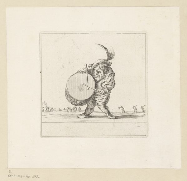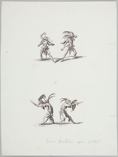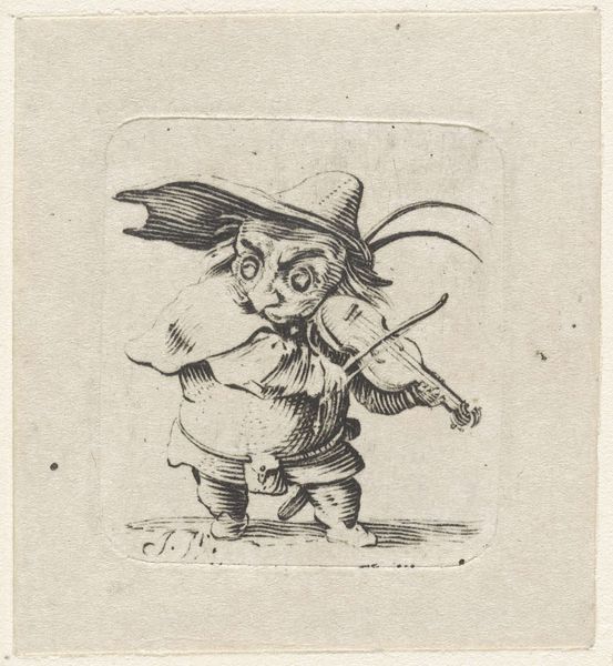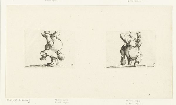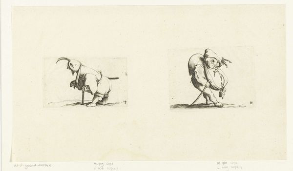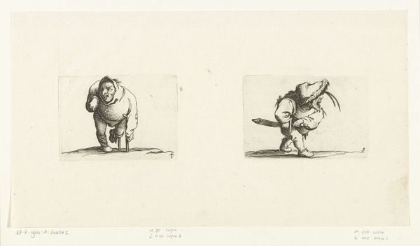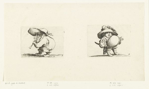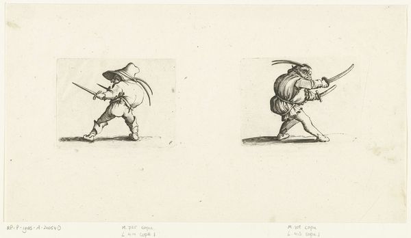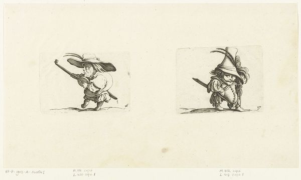 Curator: Alright, let's delve into this quirky little sheet featuring two "Dwerg met zwaard," or dwarfs with swords, as imagined by Abraham Bosse sometime between 1621 and 1676. It resides in the Rijksmuseum. What springs to mind when you look at these diminutive warriors? Editor: They're utterly charming! Almost like sketches from a child's imagination – fantastical and a little bit menacing, but in a playful way. The one with the violin...there's a story lurking there. Curator: Exactly. Bosse wasn't just about meticulously depicting reality; he dabbled in these whimsical characters. The "dwarfs," etched with such fine lines, almost feel like characters lifted from a folk tale. Look at the contrast! One carries a hefty sword, a formidable line of buttons on his back like an armored carapace. The other... he's armed with a violin, an equally potent weapon perhaps? Editor: Maybe a bit of courtly satire? Are these tiny fellows caricatures of military men or performers – two sides of power or influence? The disproportionately large head on the swordsman contrasts delightfully with the musician's feathered cap and determined expression. It speaks of art imitating life. And maybe mocking it a little, too! Curator: Indeed! It's fascinating to consider the political climate. Bosse worked during a turbulent period with its power struggles. Were these 'dwarfs' a coded commentary on society's players? His attention to their outfits, though fantastical, carries a definite air of period accuracy – there is even something akin to social commentary perhaps. Editor: I think their very strangeness endears them to us! There's a delightful naivete to them – Bosse playing with the medium itself, not taking everything so seriously, which is a wonderful relief. Curator: A perfect moment of respite in the archives. Makes you wonder what stories these little fellas were destined for in Bosse's world. Editor: Little guardians for the absurd and delightful, still striking chords through history, one etched line at a time.