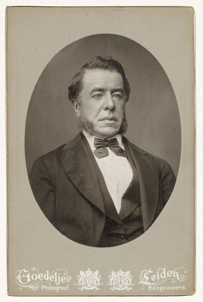 Curator: This studio portrait, taken between 1870 and 1880, presents us with J.J.L. ten Kate, a clergyman and poet, as captured through the lens of Wegner & Mottu. It’s currently housed here at the Rijksmuseum. Editor: My initial thought? Somber. Sepia tones always give that vintage melancholic aura. Though the composition, within that oval frame, has a rather strong, grounded presence, doesn’t it? Like he's gazing out from a bygone era right into our eyes. Curator: Absolutely. We have to remember, photographic processes were very different then. Think of the material constraints, the exposure times. This is a print; quite a delicate object, reflecting the early days of photographic portraiture, which of course transformed how likenesses were reproduced and circulated. Editor: True! It’s almost painterly in its light and shadow play. I can almost feel the texture of his…those peculiar sideburns! What are those mutton chops trying to convey, I wonder? Poet, clergyman—and obviously a man of impeccable facial hair. Curator: Well, they are a very good example of Victorian grooming trends. What interests me is how studio photography democratized portraiture. Previously, only the wealthy could afford painted portraits. Photography brought representations to a wider demographic. Think about the accessibility and consumption this enabled. Editor: It's fascinating to ponder, this collision of technology, status, and the human desire for memory. It speaks volumes—or, perhaps, verses!—about societal shifts. The sitter projects such gravity; perhaps that reflects the solemnity attached to the photographic process itself? Curator: Quite possibly. And considering his vocation, we may also reflect on the intersection of faith, artistry, and burgeoning industrial processes represented in this image. Photography gave artists a new set of tools. Editor: So, next time I see questionable facial hair trends, I'll be sure to remember Dominee Ten Kate, his dignified stare, and how this single photo is such a time-machine to contemplate history, culture and even personal expression, one face at a time. Curator: Indeed. It is also an exquisite material artifact of societal transformation; that tension between technological advance, and artistic intention is so very fascinating!