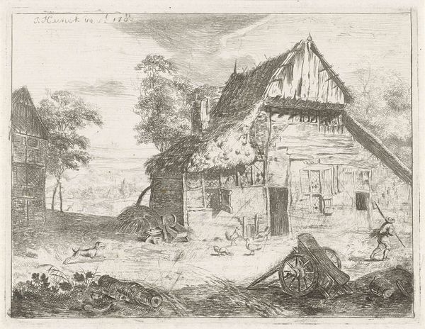 Jabes Heenck made this etching of a farmhouse, or 'boerderij' in the Netherlands during the late 18th century. It depicts a rural scene, one that suggests a world untouched by the growing urban centres, commercial trade, and intellectual life that characterized the Dutch Golden Age. The image creates meaning through its depiction of daily life. Chickens peck around in the yard and a dog wanders by. These were common subjects in Dutch art, particularly during the 17th century when artists turned away from religious art. The image is not overtly political, but it does reflect a conservative vision of Dutch life, one in which the values of hard work and self-reliance are emphasized. As historians, we must consider the social and institutional context in which art is made. Understanding the history of the Dutch Republic, its economy, and its culture can help us to better understand the meaning of this image.